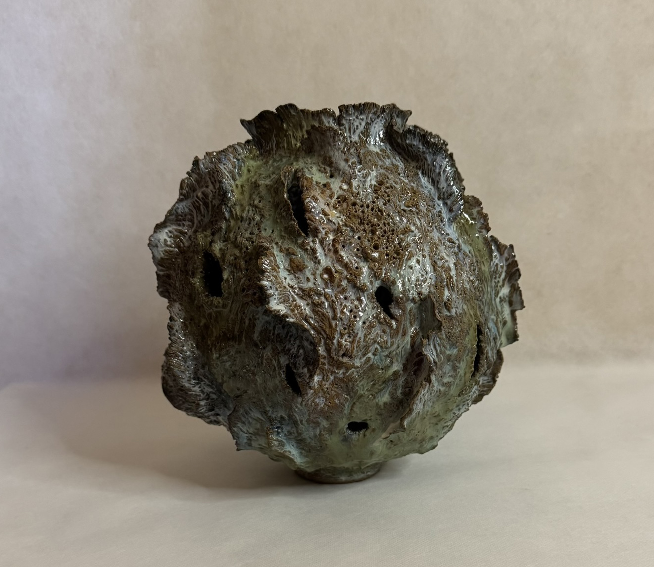 Working primarily in clay, the attention is on surface textures and fluidity, typically the rugged textures of local Maltese stone and rocks with the fragile local lace, often intentionally leaving traces of the making process visible. These imprints, together with intense carving and smoothing, create a fluid dialogue between fragility and resilience, land and sea.